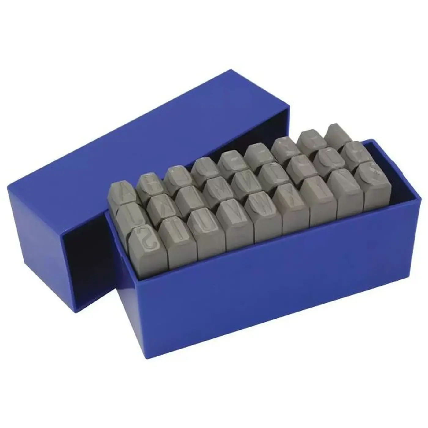 Fornecido em estojo plástico azul com 27 peças, sendo 26 letras maiúsculas e 1 carácter especial.