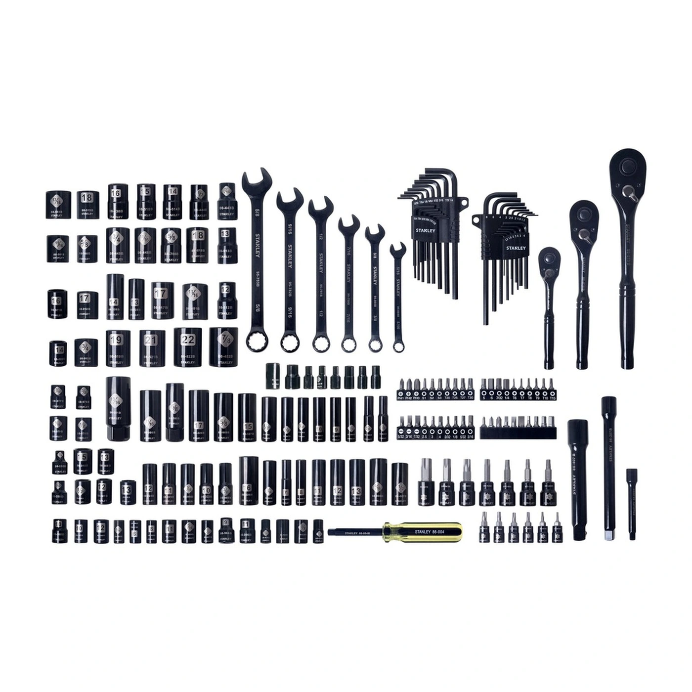 Jogo de ferramentas com acabamento preto para profissional que gosta de estar equipado com produtos de diferentes medidas (1/4", 3/8" e 1/2") para reparos de automóvel. O conjunto de soquetes profissionais cromados com acabamento preto da STANLEY contém soquetes curtos, soquetes longos, soquetes Torx, soquetes de vela de ignição, extensões de acionamento de 1/4", 3/8" e 1/2", adaptadores, bits de chave de fenda, chaves hexagonais e chaves combinadas. Chaves Catraca de 1/4", 3/8" e 1/2" com cabeça cônica de 72 dentes com botão de liberação rápida e mecanismo reversível. O revestimento durável em cromo preto proporciona maior resistência à ferrugem e à corrosão. Projetado com marcações gravadas a laser de fácil leitura. Os soquetes e chaves combinados MAXI DRIVE oferecem 15% mais torque. Garantia vitalícia limitada.